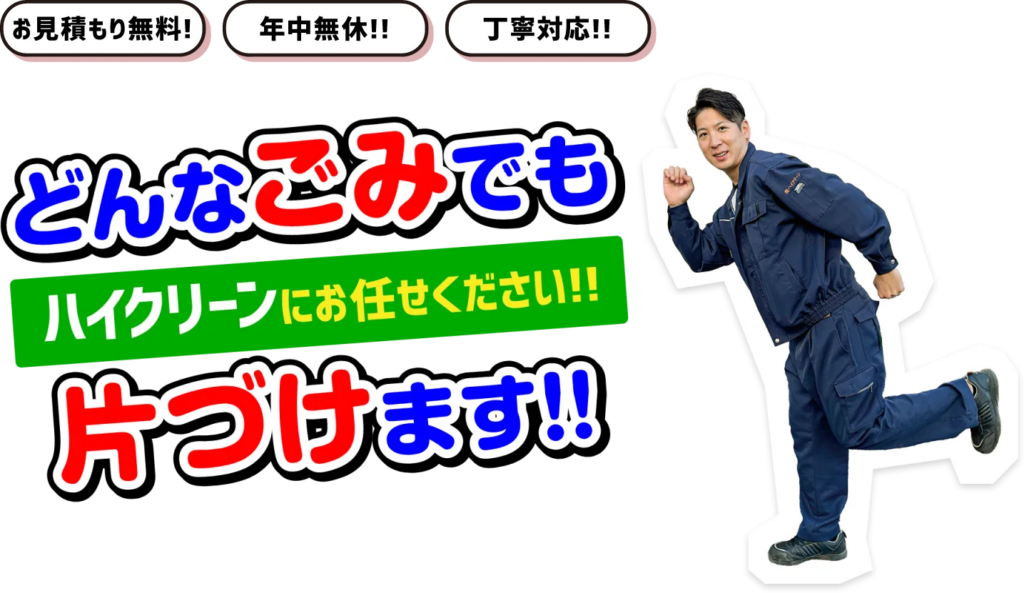 有限会社ハイクリーンは、ゴミ屋敷の清掃や片付け・掃除代行に加えて不用品回収や粗大ゴミ回収まで相談できる片付け業者です。